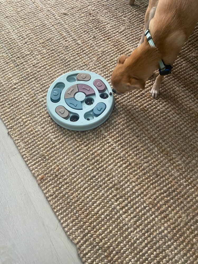 So my dog is a confirmed genius- just kidding but she solved this in less than a minute. I thought about getting a more complex puzzle but thought I’d try this one out first in case she wasn’t a genius. The only negative aspect of the product is that if your dog chews up toys she will probably chew up the puzzle pieces. So this is a puzzle I’d recommend using if you are home with your pet. I’ll look for another one to use when I am gone to keep her busy mind occupied.