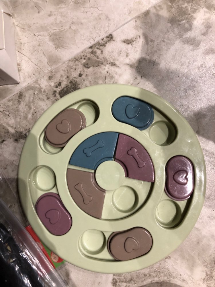 My Border Collie, Grace, just loves this “toy.” Dogs like Grace need constant mental, physical, and emotional stimulation and this thing helps for a few minutes in the evening. She has learned to check index every one, looking for a treat. When she finds one, she not only gets a treat, but she gets our praise. She has learned to use both her nose and her paw to manipulate the rounds. It is well built and heavy enough that it stays in place when Grace is playing with it. Because she still chews everything, after a few games, we take it up off the floor. Wonderful toy and I’m highly recommending.
