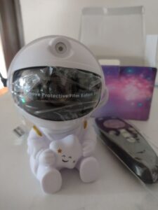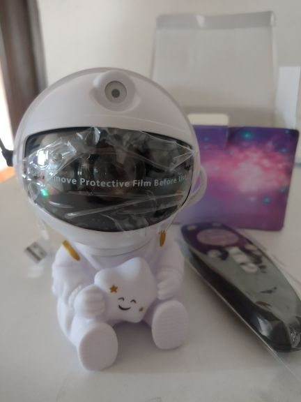 Very cool projector, the package was not damaged, the package includes: Projector, remote, C-tab cord. The project itself also has 3 control buttons. Can adjust the shades, brightness level, the astronaut head itself is movable and can set as you like! The children liked it very much